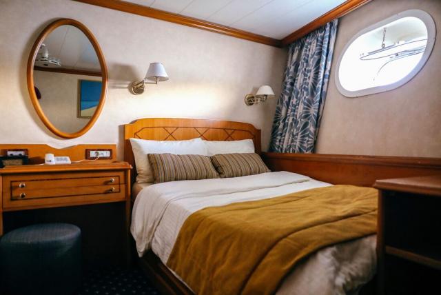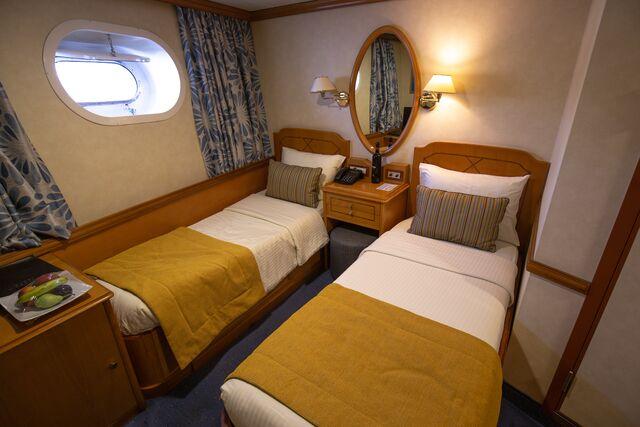 The category C cabins are located on the lower deck featuring portholes and bathrooms with showers. The cabins are equipped with individual controlled A/C, piped music, TV (Satellite channels), telephone for internal use, mini safe box, mini fridge and hairdryer adapters (voltage: 220 V).