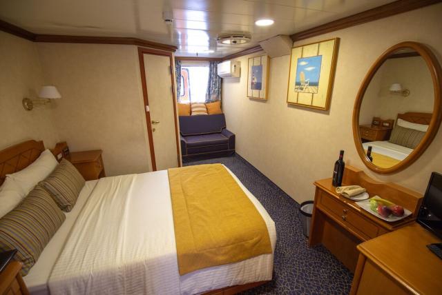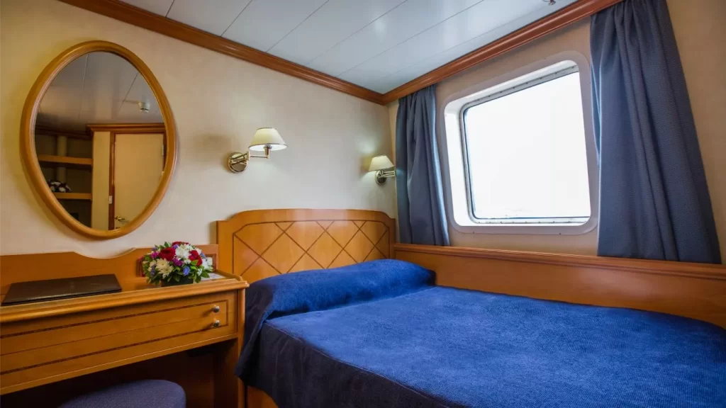 Category P cabin is located on the upper deck offering a large window and bathroom with showers. The cabin is equipped with individual controlled A/C, piped music, TV (Satellite channels), telephone for internal use, mini safe box, mini fridge and hairdryer adapters (voltage: 220 V).